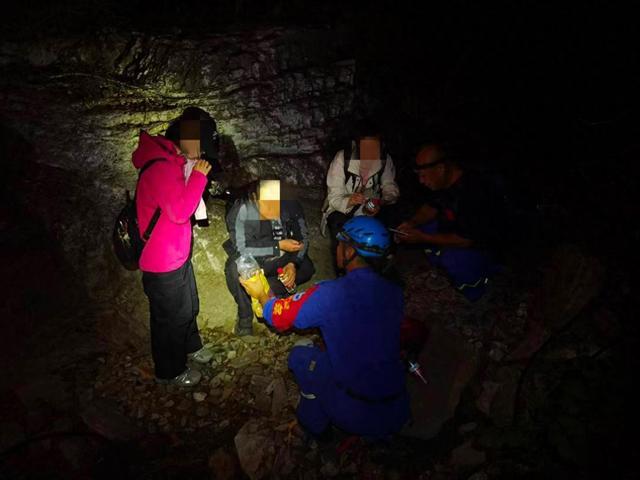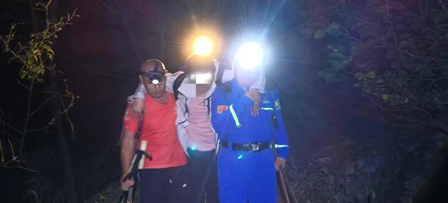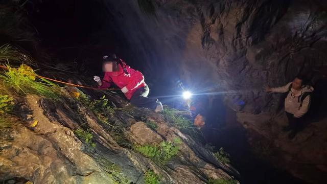 上山途中岔路很多,经验丰富的队员们需不断修正方向。22时许,队员们找到3名被困者深资管,当时3人处在一处3米高的断崖下,询问得知,他们身体状况无大碍,只是有一名被困者左膝盖有点受伤,队员们赶紧把带来的食物和水发给他们,同时想办法把三人安全转移到断崖上方。