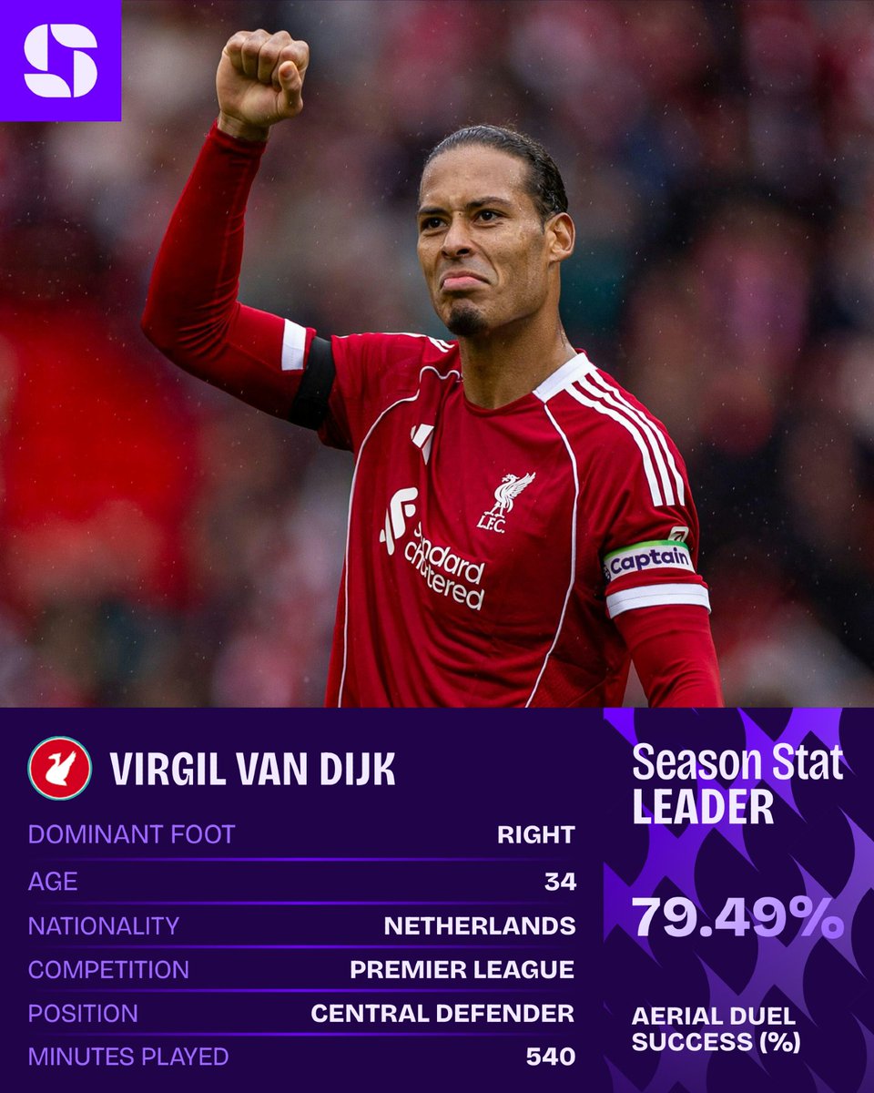 虎扑10月04日讯 据Squawka统计维嘉资本,本赛季英超所有参与20次以上头球争顶的球员中,范戴克成功率最高。